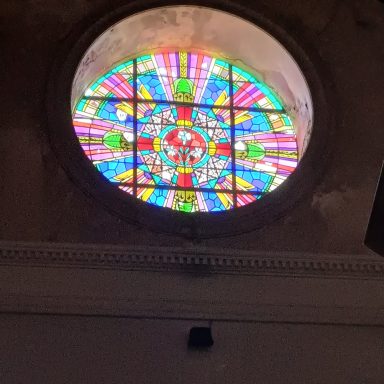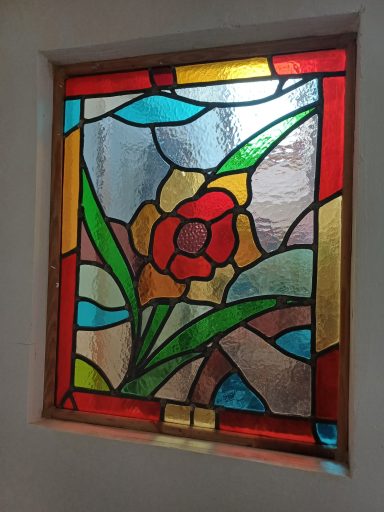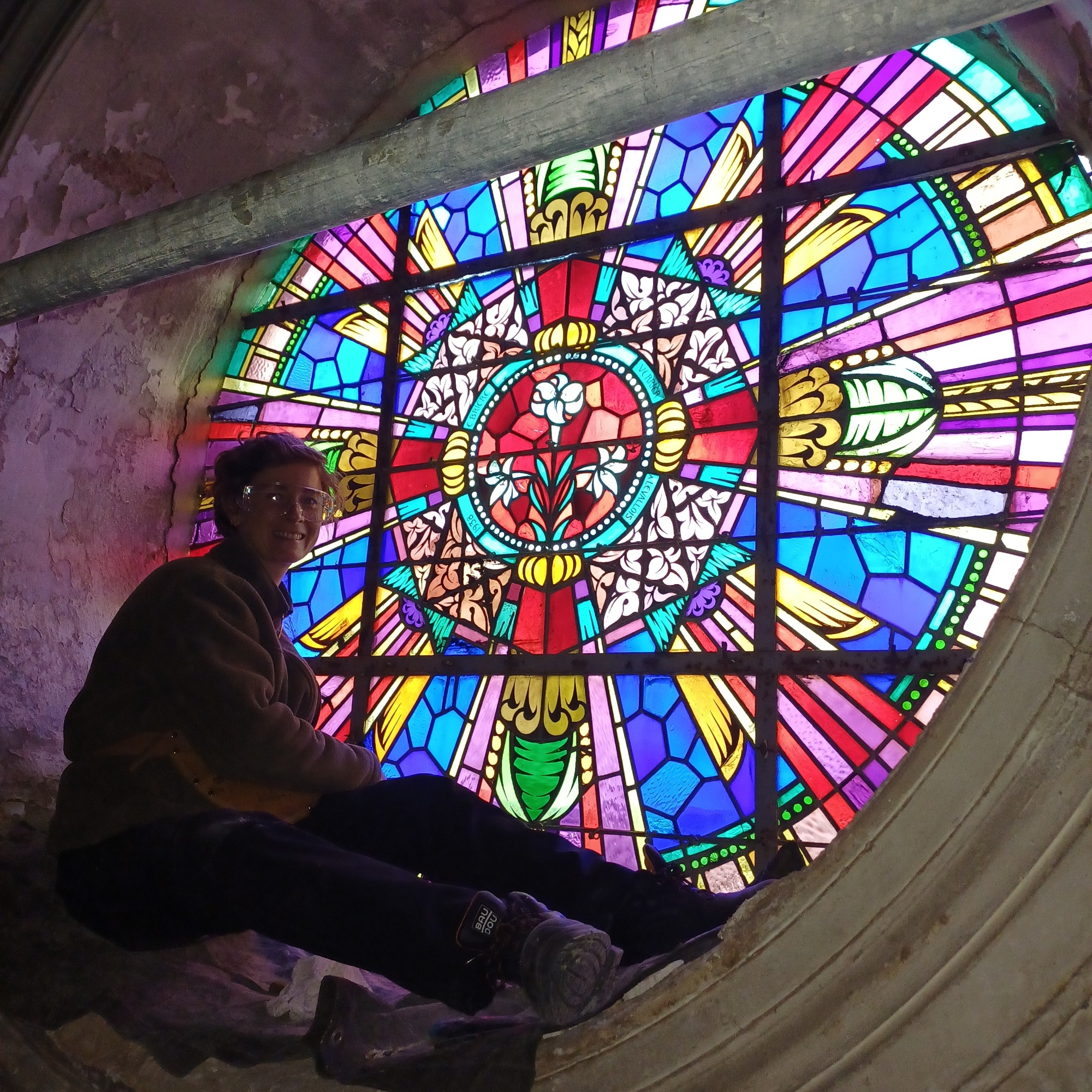 Vitrail reposé en attente du calfeutrement à la chaux